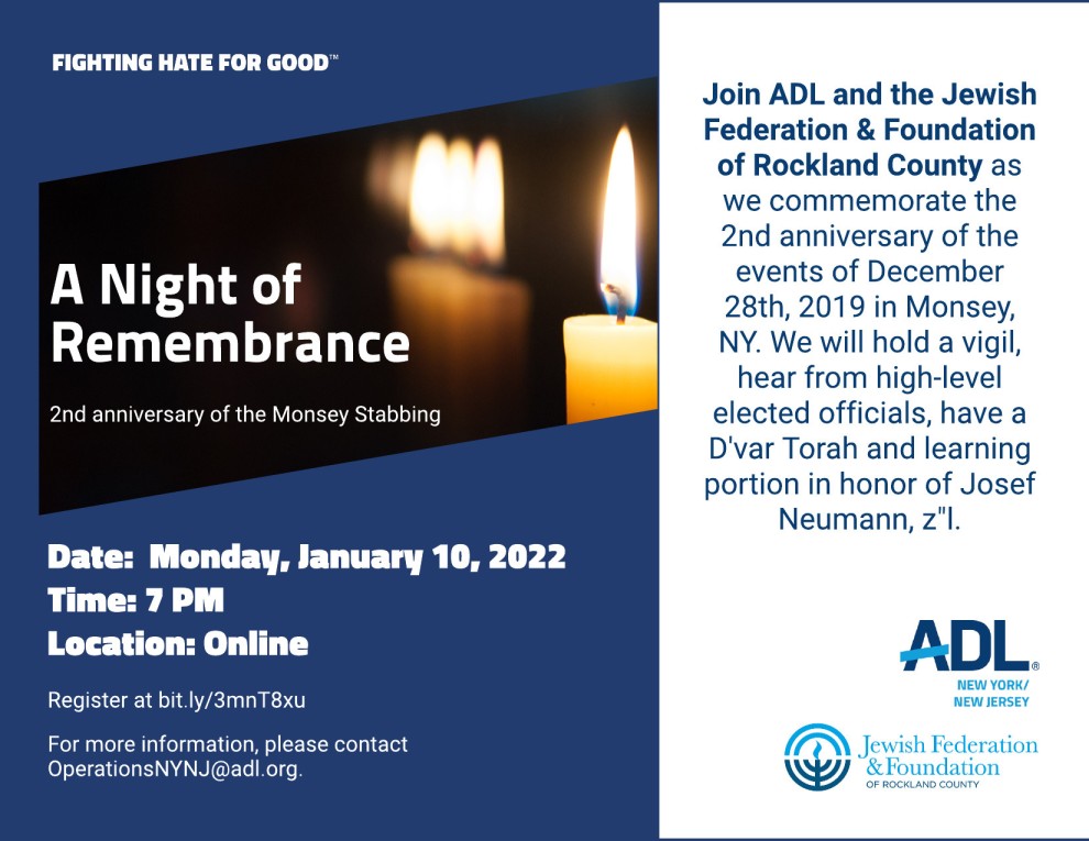 Join ADL and the Jewish Federation & Foundation of Rockland County as we commemmorate the 2nd anniversary of the events of December 28th, 2019 in Monsey, NY. We will hold a vigil, hear from the high-level elected officials, have a D'var Torah and learning portion in honor of Josef Neumann, z"l.
